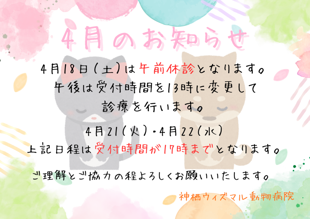 <臨時休診> 4月18日(土)午前臨時休診 振替として午後の診療を13時~18時で行いま…